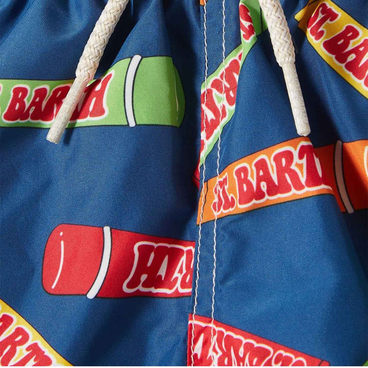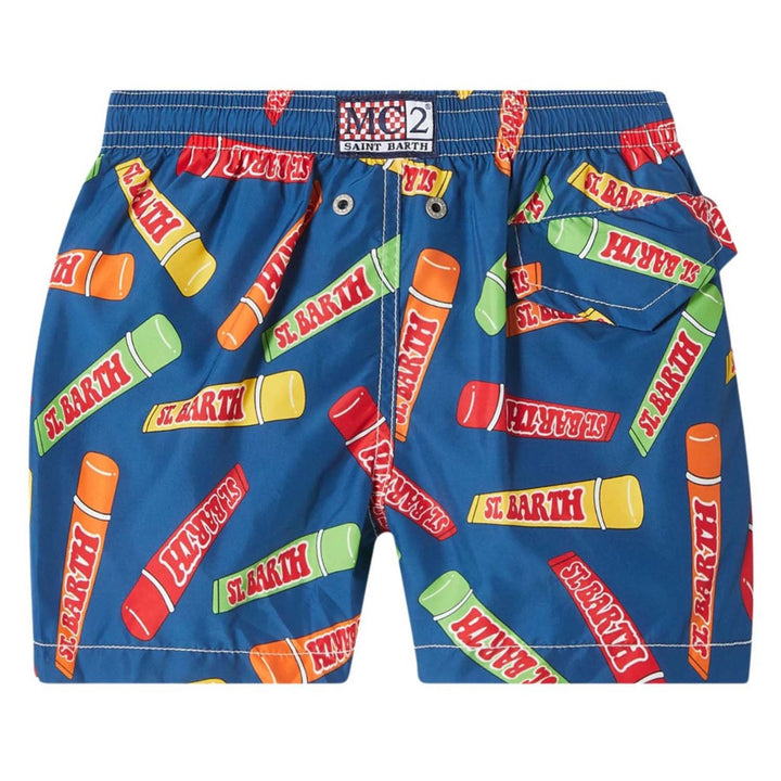 The Boys Colored Print Swim Shorts with Bag from MC2 Saint Barth feature a vibrant, multicolored design perfect for summer fun. Made from quick-drying fabric, these lightweight shorts offer comfort and flexibility for swimming or beach days. The elas