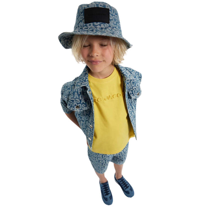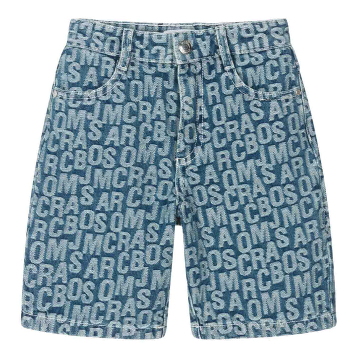 Mid-blue jacquard denim shorts for boys by American brand MARC JACOBS. For a distinctive look, they are patterned in the designer's Jumbled logo, with a black rubberised logo patch on the back. Made in non-stretch cotton denim, this four-pocket style