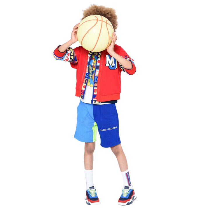 These casual blue shorts for boys, by MARC JACOBS, are made in soft cotton jersey. They have a neon yellow logo print, with a smooth matching insert between the legs for a dramatic designer look. In a cool contrasting design, there are comfortable po