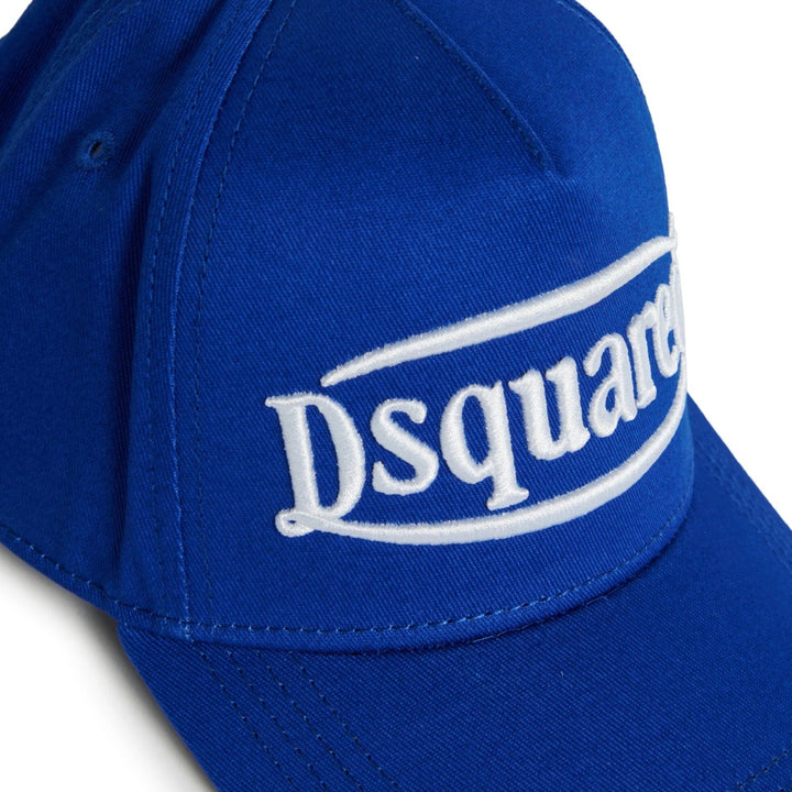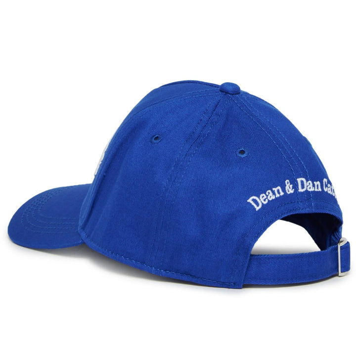 This is a royal blue Dsquared2 baseball cap featuring a bold and sporty design. The front showcases an embroidered Dsquared logo in white, styled in a curved, dynamic font. The cap is made from a durable fabric, likely cotton or a cotton blend, ensuring comfort and breathability. It has a curved brim for sun protection and stitched panels with ventilation eyelets for added airflow. The back likely features an adjustable strap for a customizable fit. This cap adds a stylish, streetwear-inspired touch to casual outfits.