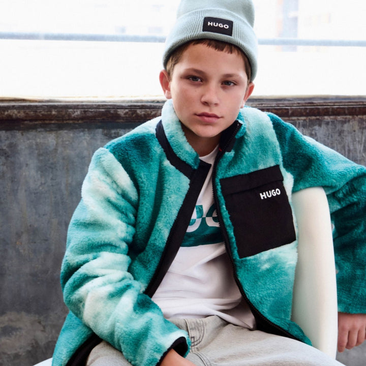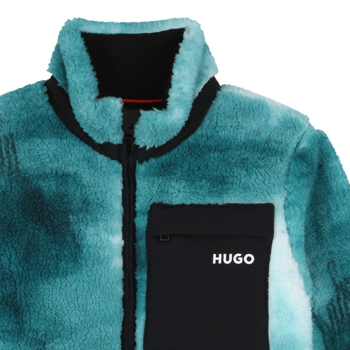 Boys blue logo-patch fur jacket by HUGO ultra-soft faux fur design featuring a front zip closure and signature red logo patch, offering warmth with a stylish urban edge.