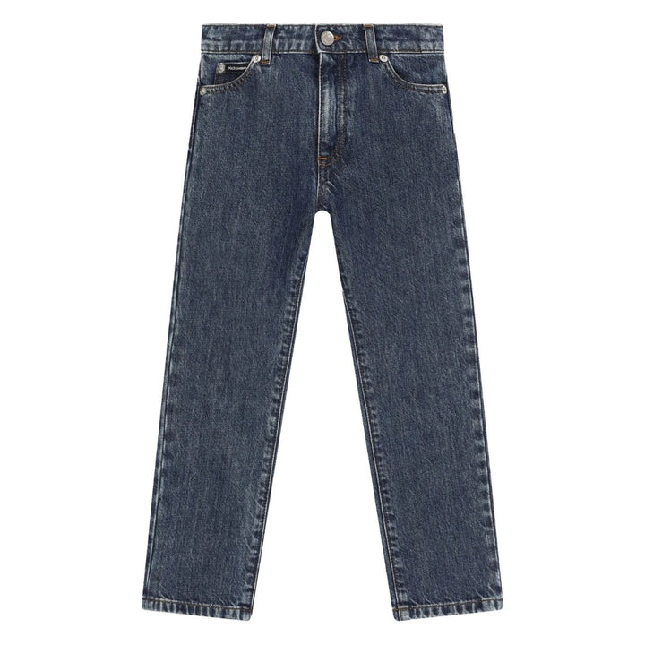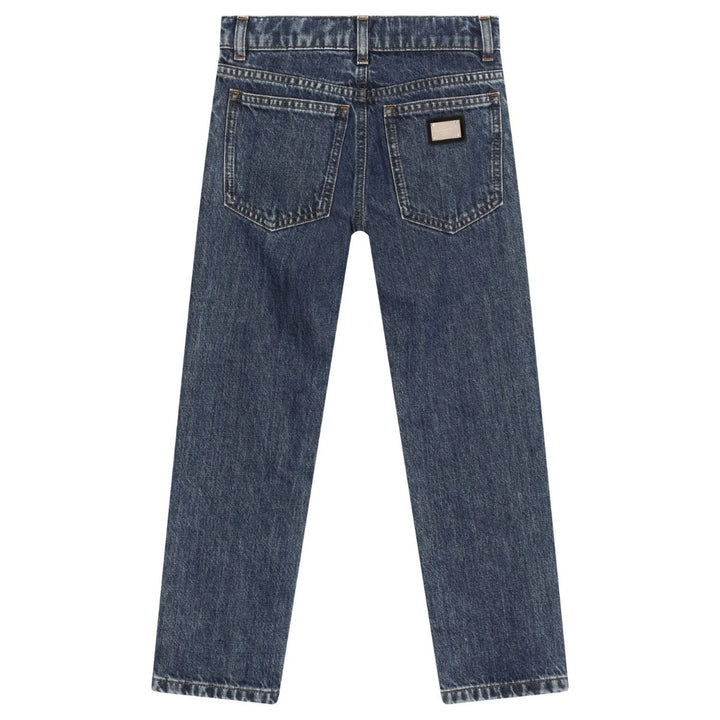 Dolce & Gabbana Kids indigo blue skinny jeans in soft cotton denim, featuring a mid-rise fit, five-pocket design, and a silver-tone logo plaque. Made in Italy for classic everyday style.