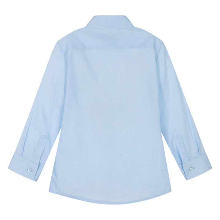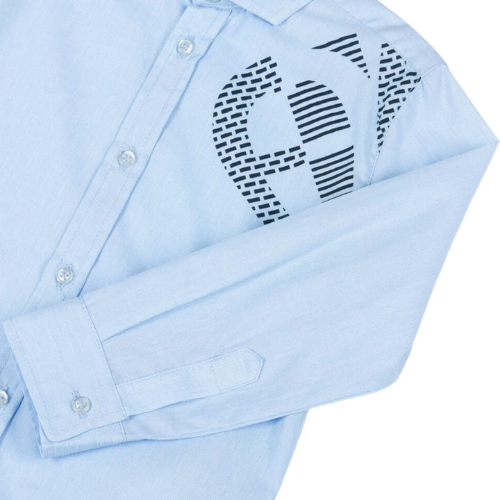 Smart blue cotton shirt for boys by AIGNER, with a fine, striped weave. Soft and lightweight, it has a navy blue logo print on one side and a stylised logo design on one shoulder, featuring the signature 'A' horseshoe motif. It fastens with branded buttons on the front and cuffs.