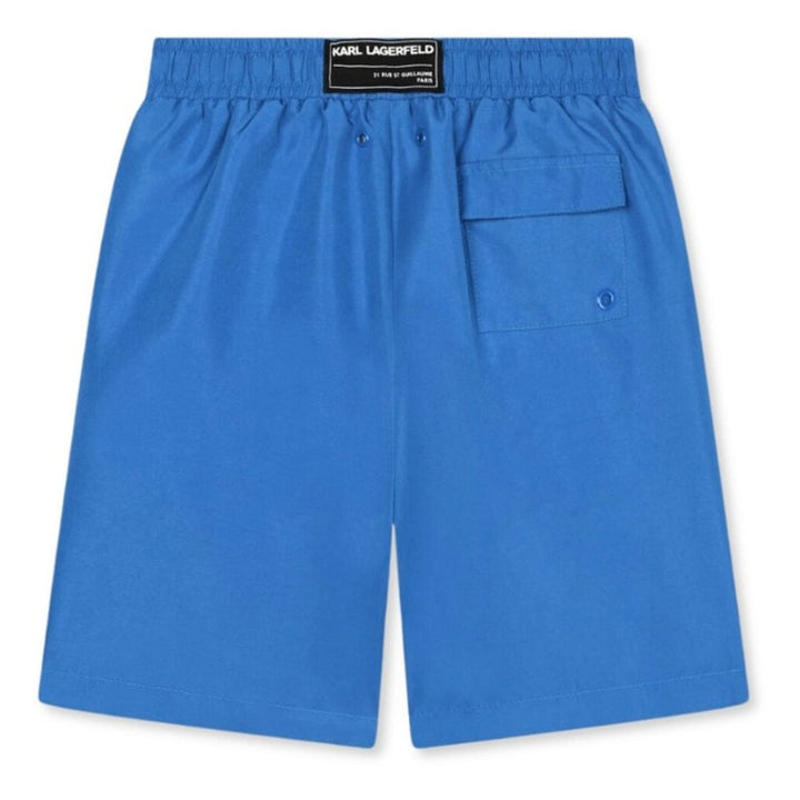 Blue swim shorts for boys by KARL LAGERFELD. Made from lightweight fabric with the brands logo print in white on one leg. They are lightweight, with a mesh lining and an elasticated drawstring waist. Comes with inner attached mesh brief.