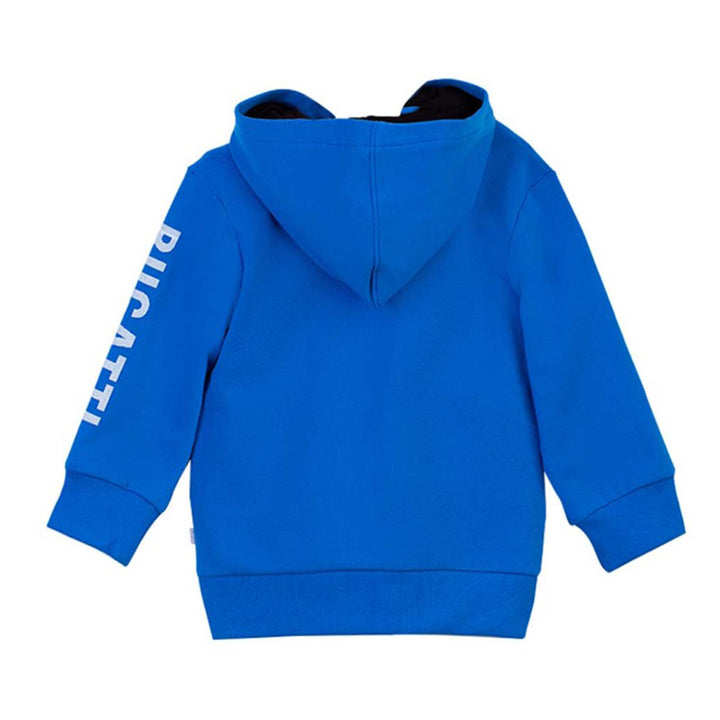 Bright blue zip‑up hoodie featuring a colour‑block panel detail on the front with contrasting black and white stripes and a small red logo patch. The hood and long sleeves offer cosy coverage, while bold “BUGATTI” branding down the sleeve adds a sporty designer touch, perfect for casual layering.