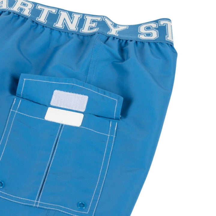 From Stella McCartney Kids, these simply stylish blue swim shorts for boys are made using recycled materials. The silky smooth fabric is lightweight and lined with soft mesh for comfort. For brand recognition, the designer's name is featured across the elasticated waistband.