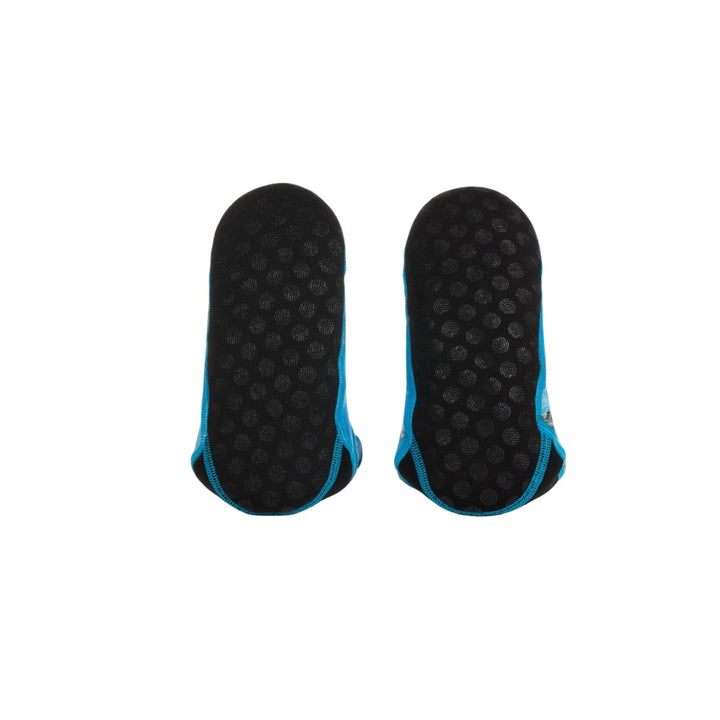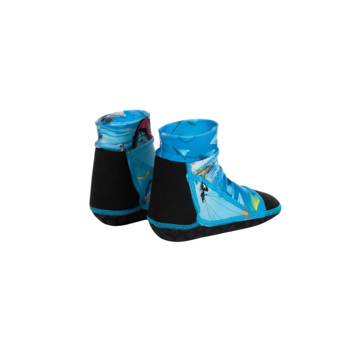 Boys aqua shoes by Molo, in a colourful ocean themed print with black trims and blue stitching. Easy to pull-on, they are made from soft and stretchy recycled fabric, with lightly padded heels, toes and non-slip soles.