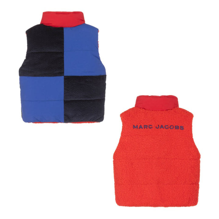 A blue and red reversible gilet for boys from MARC JACOBS, with puffer-style quilting. The blue side is panelled in silky fabric and soft cotton corduroy and detailed with a red embroidered monogram on the chest. Made in fluffy teddy fleece, the red
