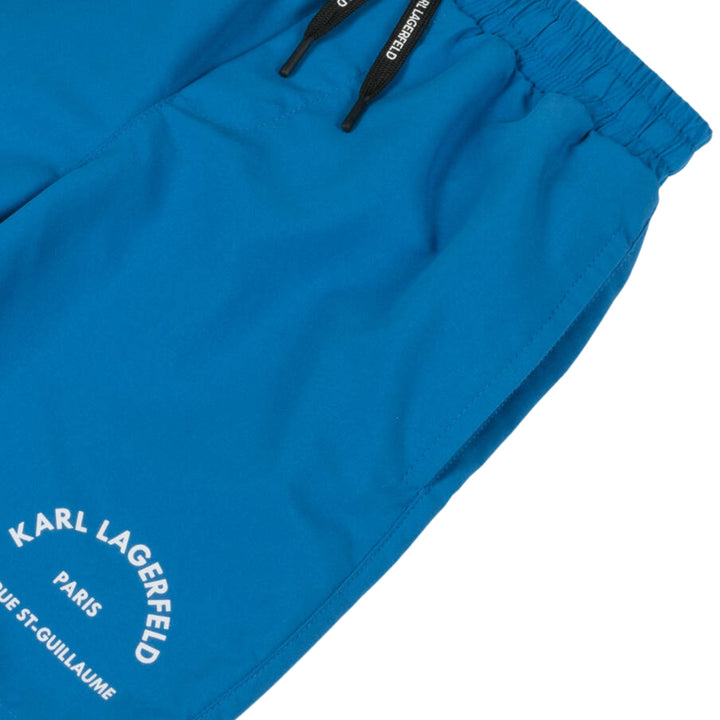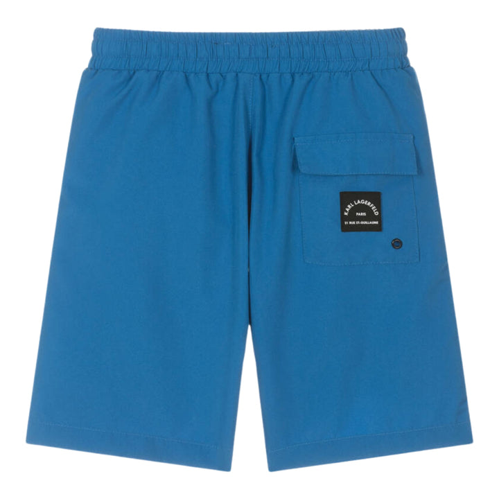 Bright blue Mini-me swim shorts for boys by KARL LAGERFELD KIDS, made in soft and lightweight fabric. These easy drawstring shorts have a Rue St Guillaume print on the leg and a black logo patch on the back pocket. The shorts are lined with mesh for