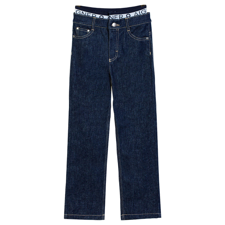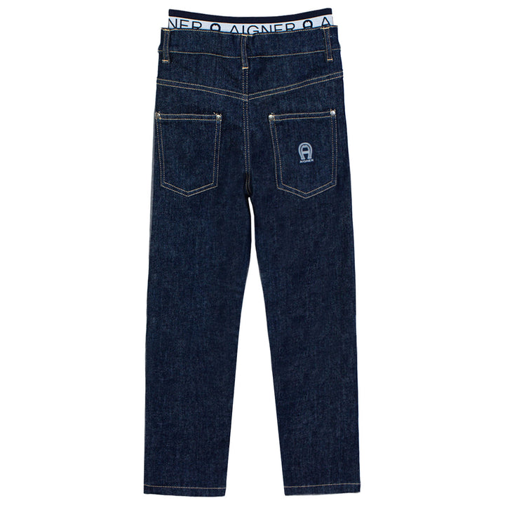 These blue elastic waist jeans from Aigner offer the perfect balance of comfort and style. Designed with a soft cotton blend and added stretch, they ensure easy movement and a great fit. The elasticated waistband makes dressing simple ideal for activ