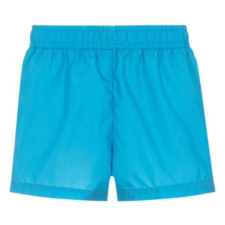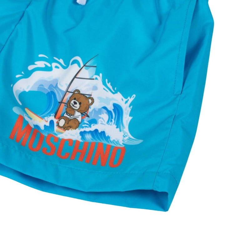 Blue swim shorts for boys from Moschino, made in soft and lightweight fabric. On one leg, they have a bold logo print and surfing bear illustration for a branded look. They have an easy drawstring waist and a comfortable mesh lining. Side pockets are