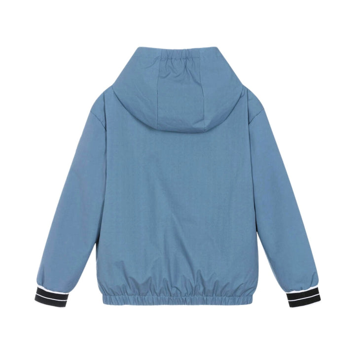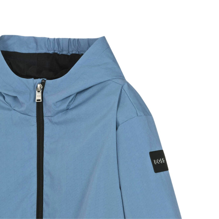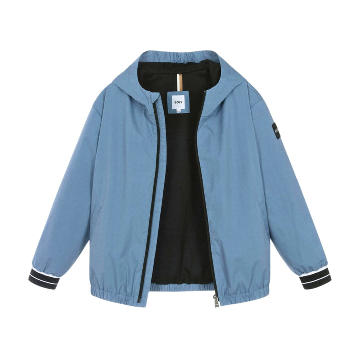 A dusky blue windbreaker jacket for boys by BOSS, with black and white detailing. This water-repellent jacket is made in a silky, matte weave with a subtle, jacquard houndstooth pattern. The striped, elasticated cuffs and jersey-lined front pockets h