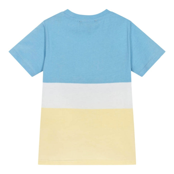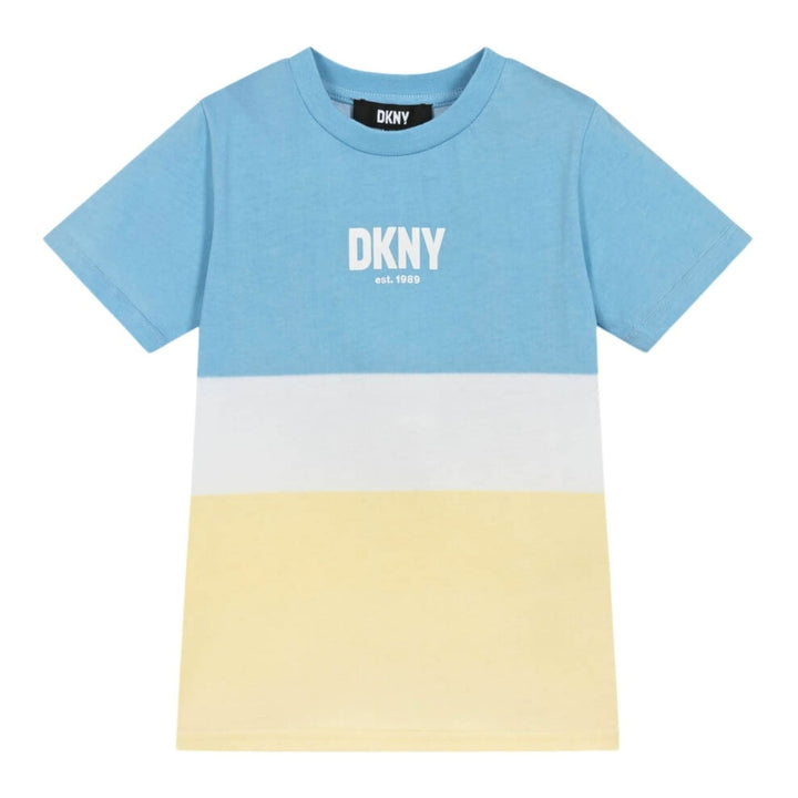 A colourblock cotton jersey T-shirt for boys by DKNY, with a blue, white and yellow design. Styled with short sleeves and a lightly ribbed crew neck, this casual tee has a distinctive white logo print on the front for instant designer recognition.