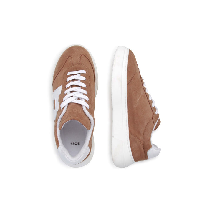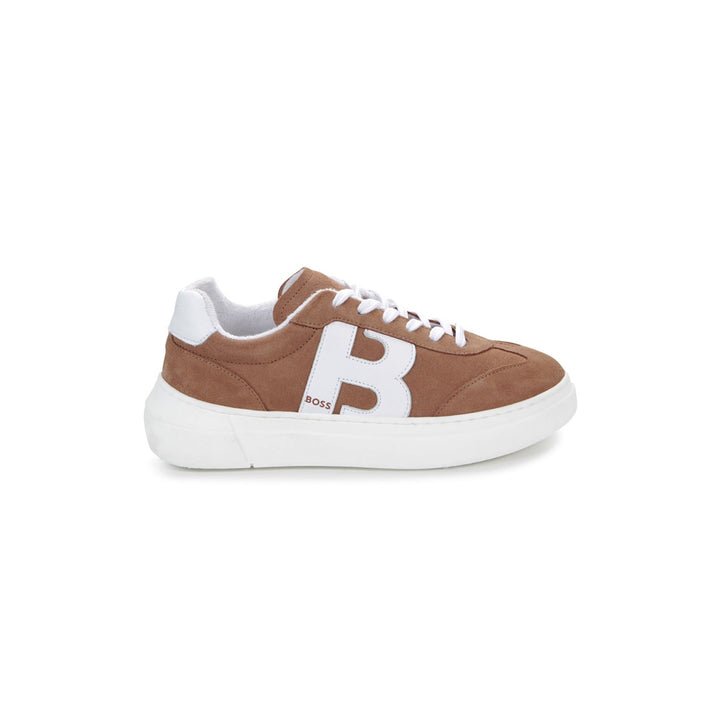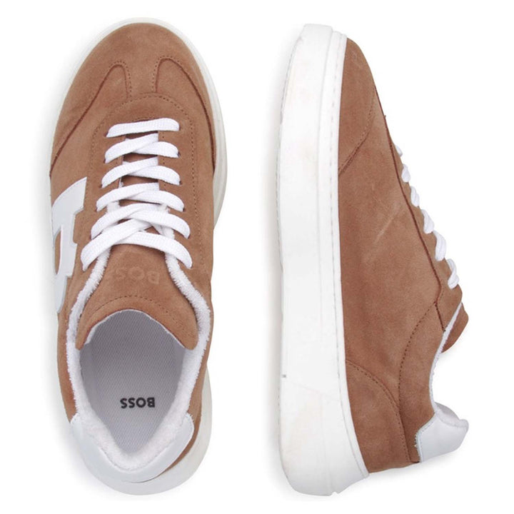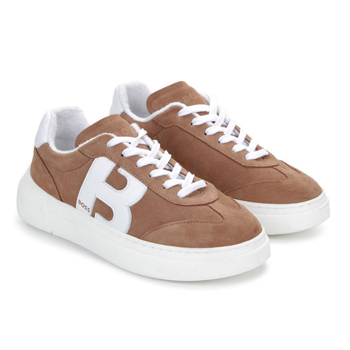 Boys low-top suede sneakers from BOSS Kidswear featuring camel brown, cloud white, front lace-up fastening, round toe, flat rubber sole and suede.