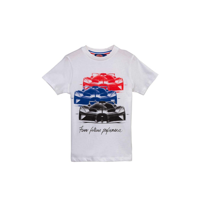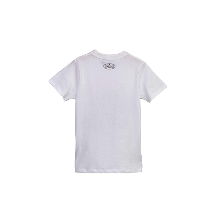Boys white printed t-shirt by Bugatti Kids. Made from soft cotton, it features a black text and sketch car print in black, red and dark blue on the front. It has white neckline and logo print with half sleeve.