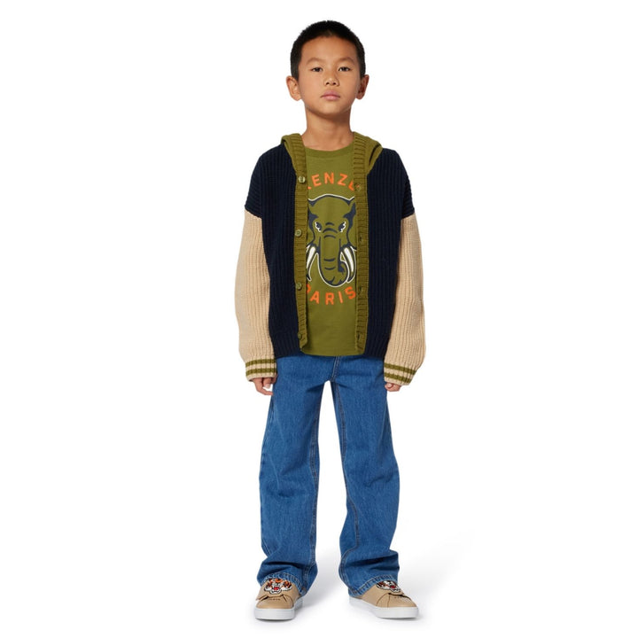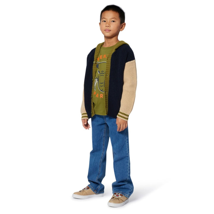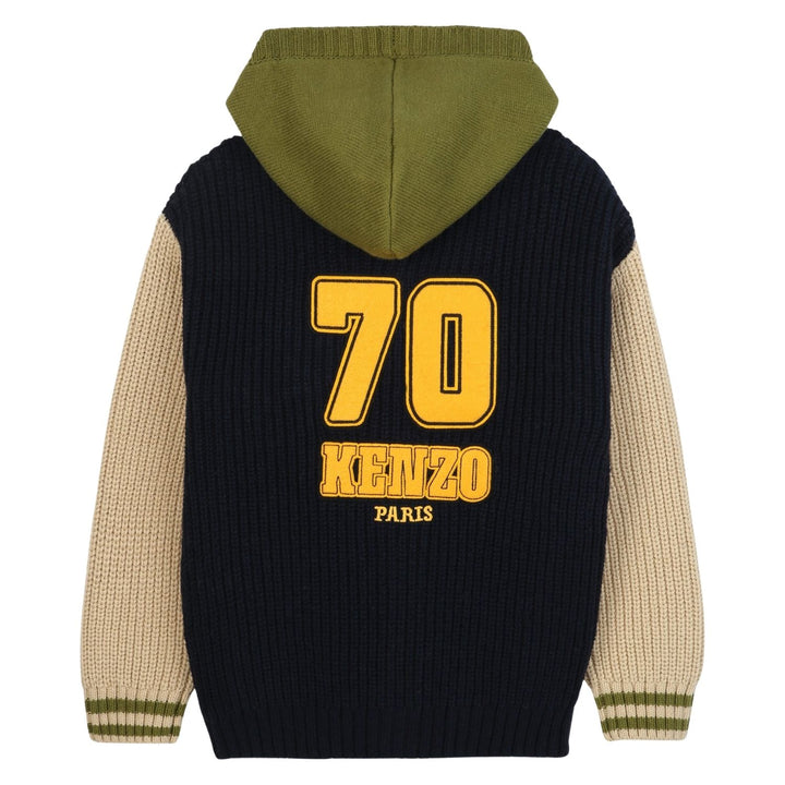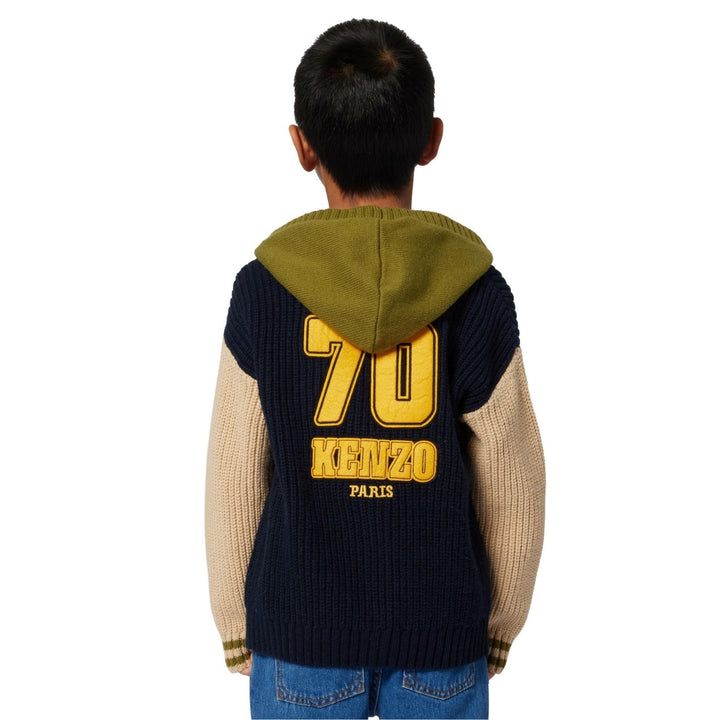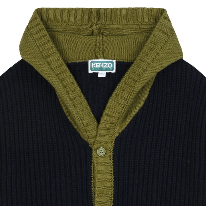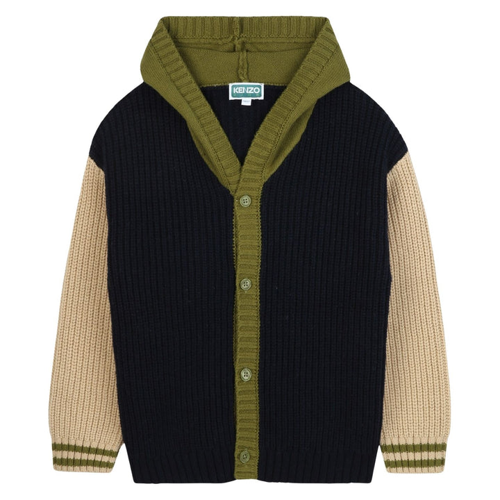 This cozy Kenzo Kids cardigan features a stylish colorblock design with a black body, khaki green hood and trim, and beige sleeves accented by green stripes at the cuffs. Crafted from a soft, chunky knit for warmth and comfort, it is finished with a