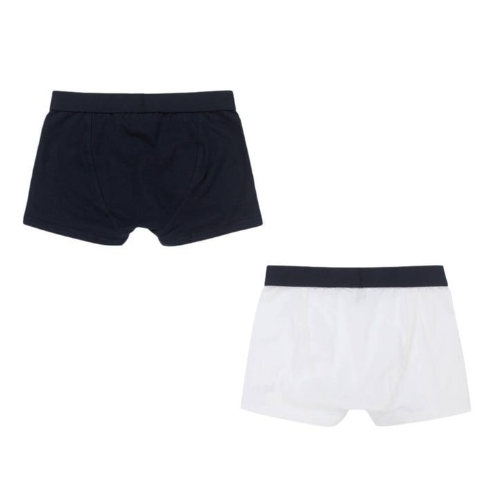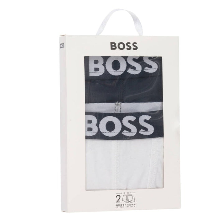 For boys, pack of two boxer shorts in White and Blue by BOSS with their branded logo waistband. Cool and comfortable, made in soft cotton jersey they also have logo prints on one leg.