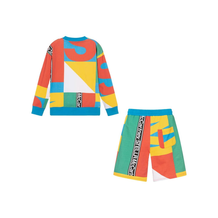 Bold and eye-catching tracksuit shorts set for teen boys by Stella McCartney Kids, with a colourful geometric logo pattern. Made in soft organic cotton sweatshirt jersey, both pieces are detailed with black and white logo stripes for instant brand re