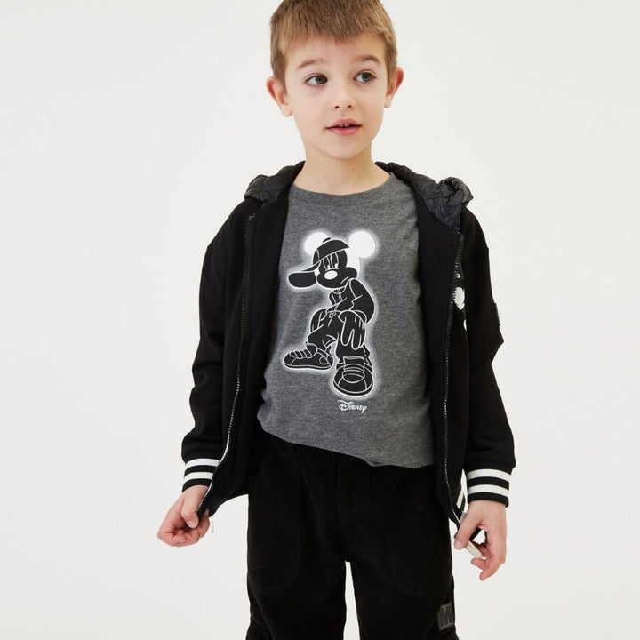 Classic, everyday grey T-shirt for boys by Monnalisa, made in soft cotton jersey. It has a striking black and white print of Disney's Mickey Mouse on the front and a branded tab on the back.