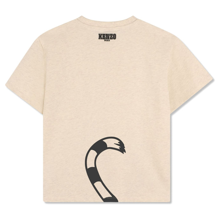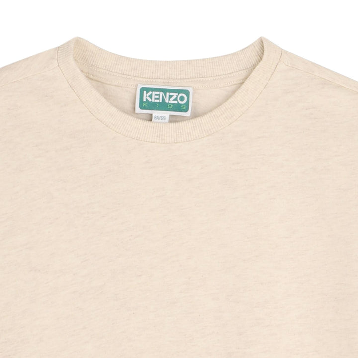 A cream T-shirt for boys by KENZO KIDS, made in soft organic cotton jersey. Casual and comfortable, it has a vintage, cosmic-themed logo motif on the front, combining playful elements with iconic branding.