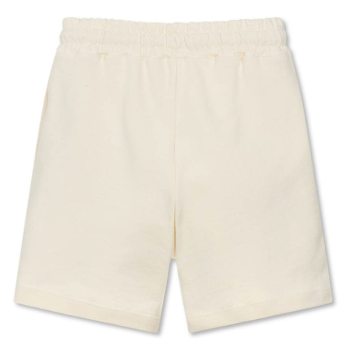 Casual cream drawstring shorts for boys by MSGM, made in soft cotton sweatshirt jersey. Inspired by contemporary, streetwear style, they have a fun and colourful graffiti artwork on the front illustrates logo-inspired palm trees, a surfer, stars and