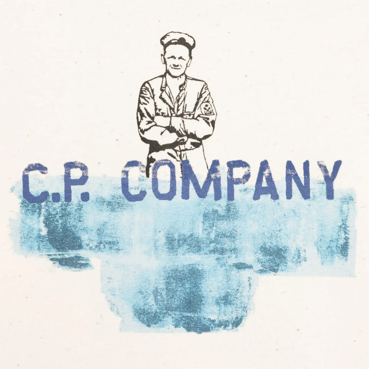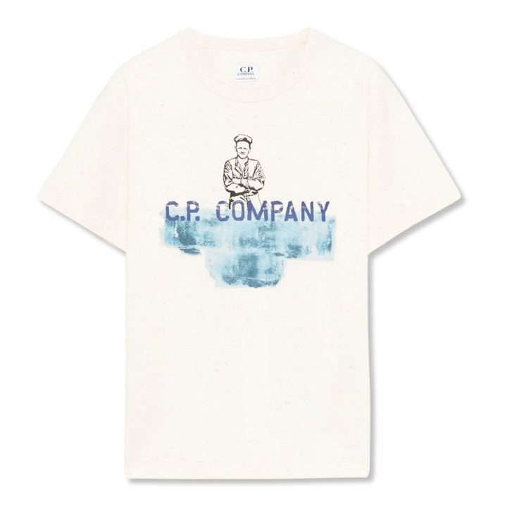 This cream T-shirt from C.P. Company Kids features a unique front graphic with a sketched figure and bold blue logo print. Designed with a crew neck and short sleeves, it blends artistic flair with everyday comfort.