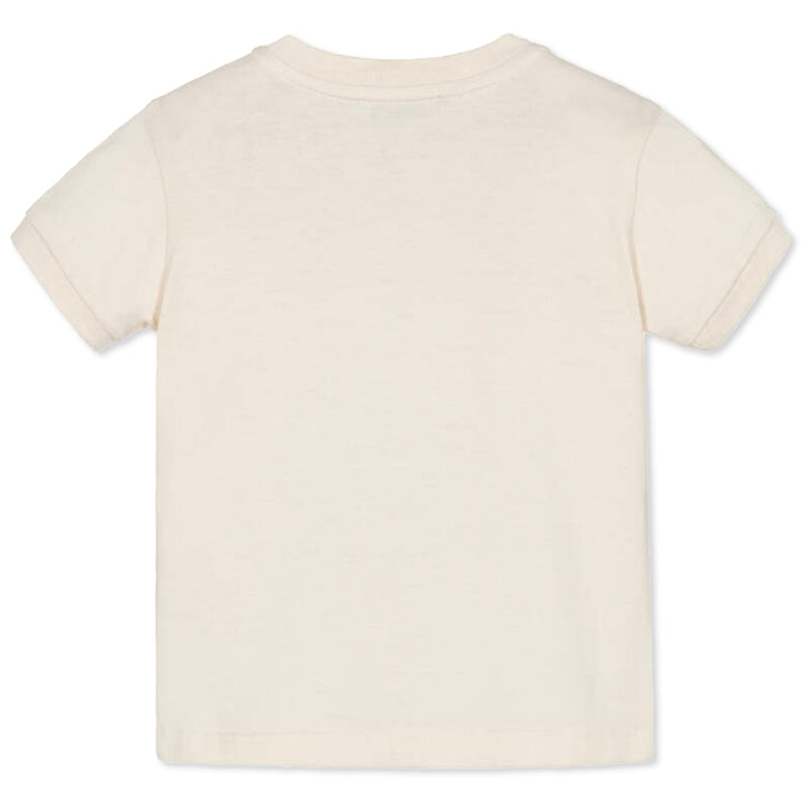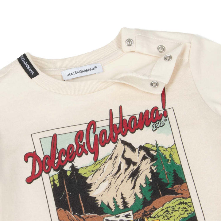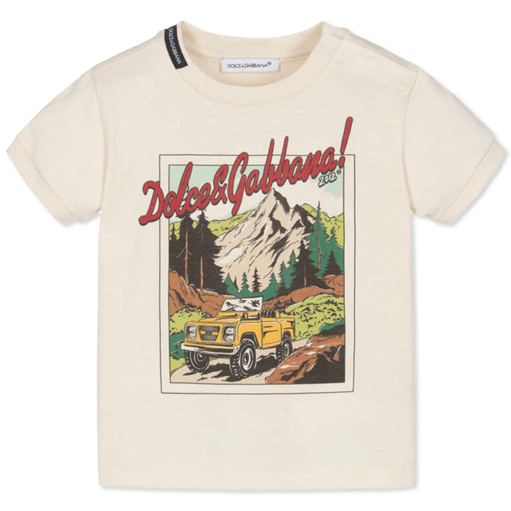 A cream cotton T-shirt for baby boys by luxury Italian brand, Dolce & Gabbana. A cool, vintage graphic of a mountain explorer scene with a statement logo is highlighted on the front, bringing fun adventure to this casual top. There is a logo tab on t