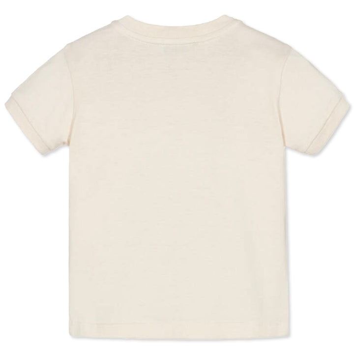 A cream cotton T-shirt for baby boys by luxury Italian brand, Dolce & Gabbana. A cool, vintage graphic of a mountain explorer scene with a statement logo is highlighted on the front, bringing fun adventure to this casual top. There is a logo tab on the crew neck and neat poppers on one shoulder.