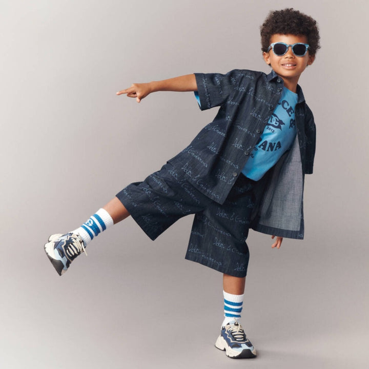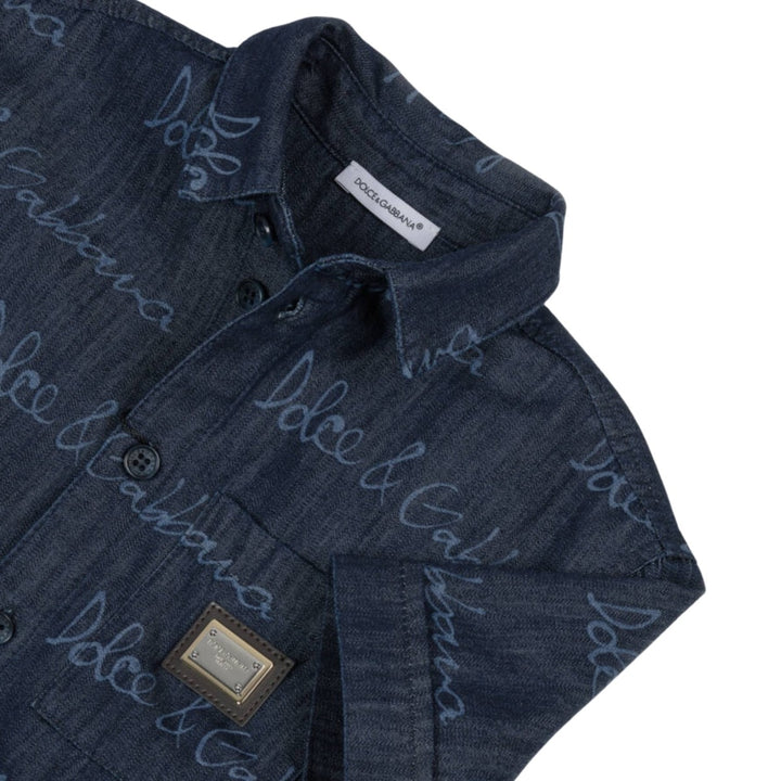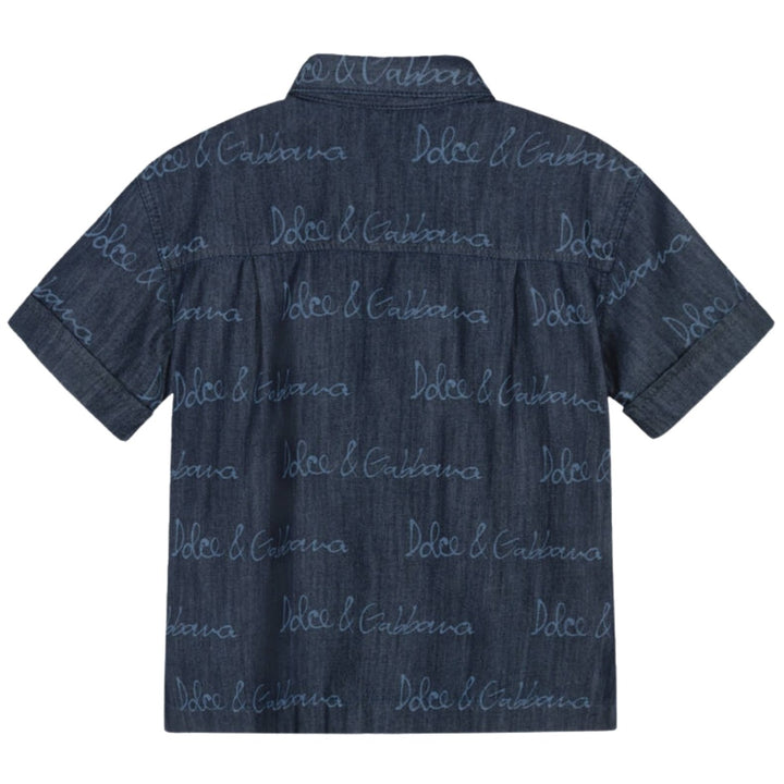 Dark blue cotton shirt for boys by luxury designer Dolce & Gabbana, made in lightweight chambray with a buttoned front. From the boys Riviera collection, this short-sleeved piece has a laser-etched logo design for instant brand appeal. For casual occasions or smart-casual gatherings, it has a neat collared neckline and a metal logo tag on the chest pocket.
