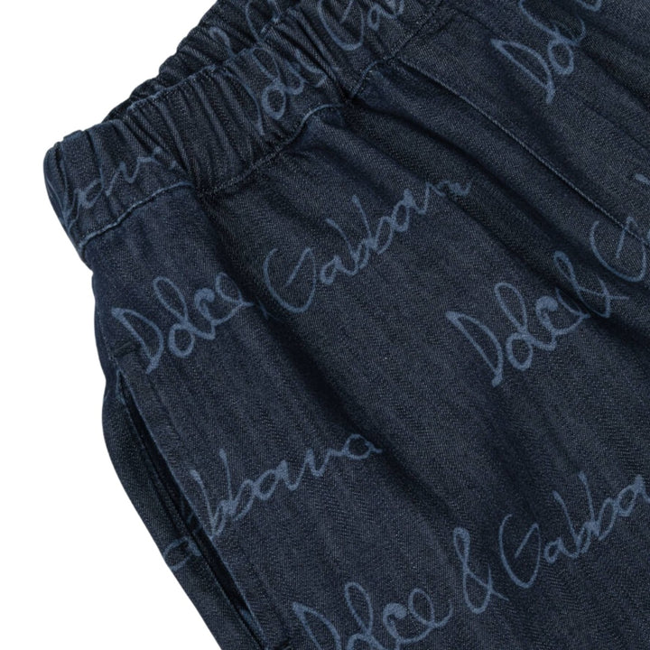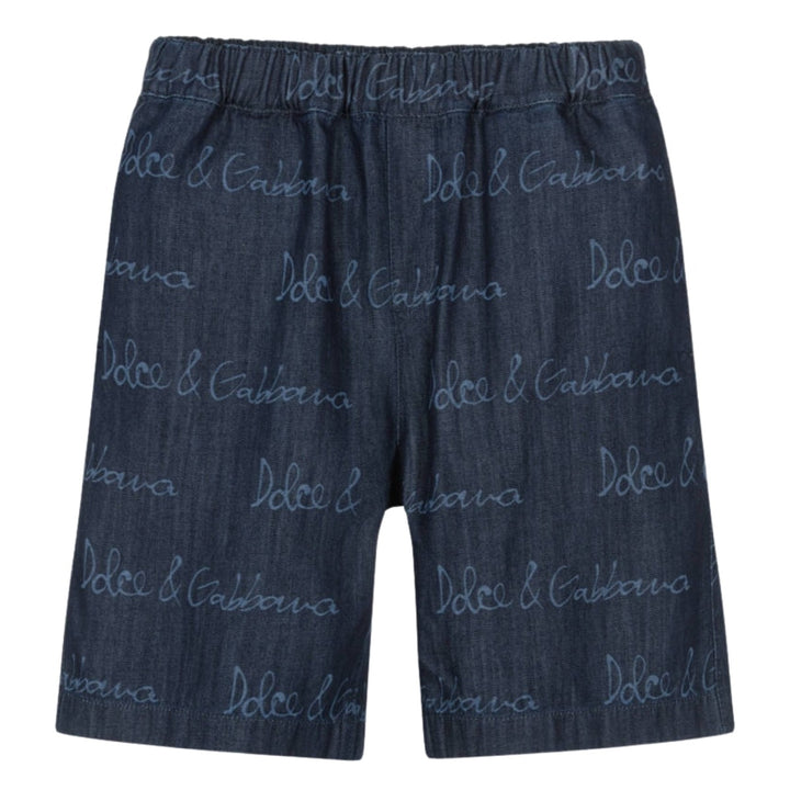 Dark blue cotton shorts for boys by luxury designer Dolce & Gabbana, made in lightweight chambray. From the boys Riviera collection, these oversized shorts have a laser-etched logo design for instant brand recognition. They have neat side pockets and an elasticated waistband for a comfortable fit. A metal logo tag can be seen on the back pocket.