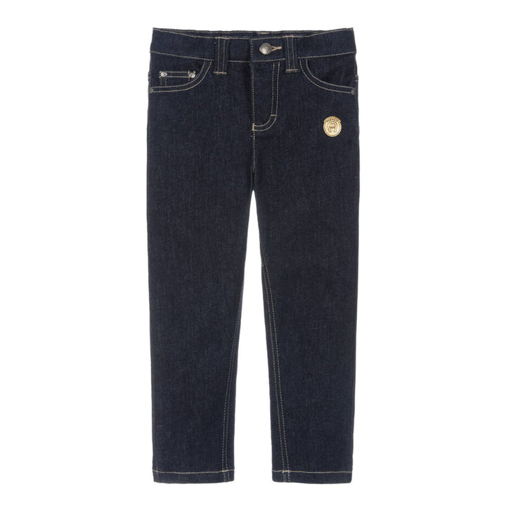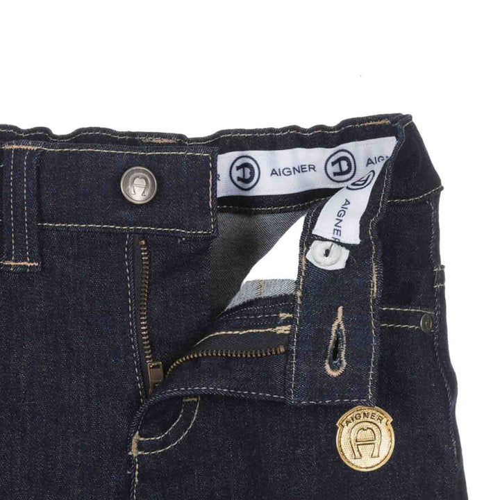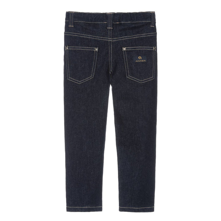 Dark blue jeans for boys by AIGNER, made in soft cotton denim with a slight stretch for comfort. A classic five pocket style, they have a golden logo patch on the front, featuring the signature 'A' horseshoe logo, and a further embroidered logo patch