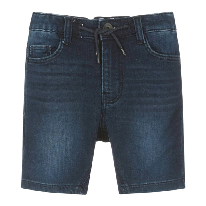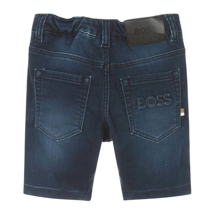 Boys dark blue shorts by BOSS, made in soft cotton-rich jersey with the look of denim. Ideal for casual dressing, these comfortable shorts have an easy drawstring waist and a button and zip fastening. An embossed logo can be seen on the back pocket,