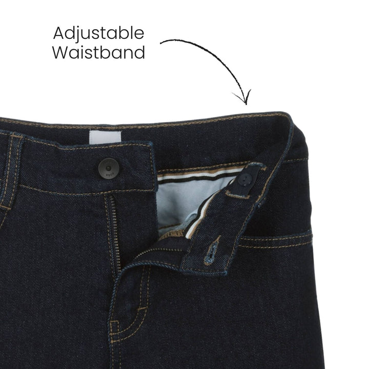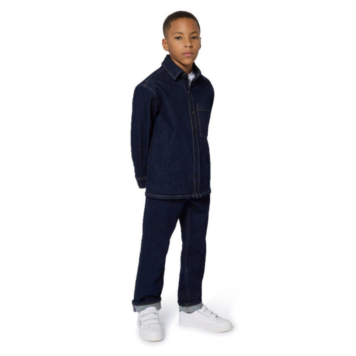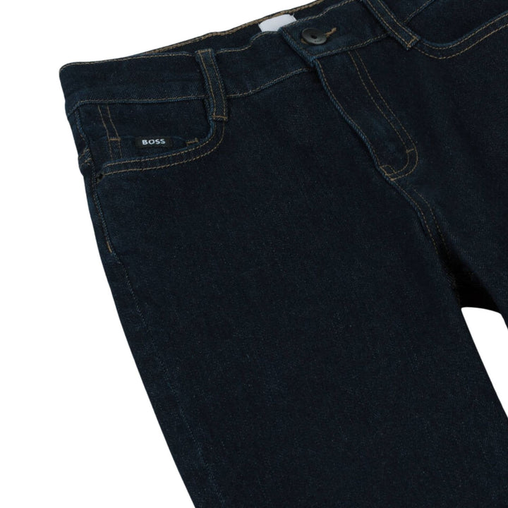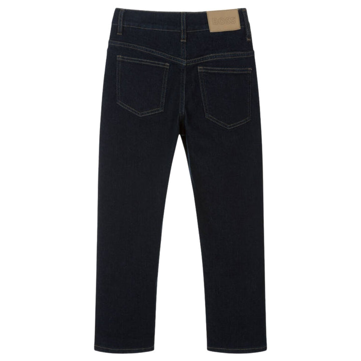 Dark blue wash denim jeans for boys by BOSS, made in soft, durable cotton. Classically styled with five pockets and contrast beige stitching, these loose-fitting jeans feature a button and zip fastening and a useful adjustable waist. For a signature