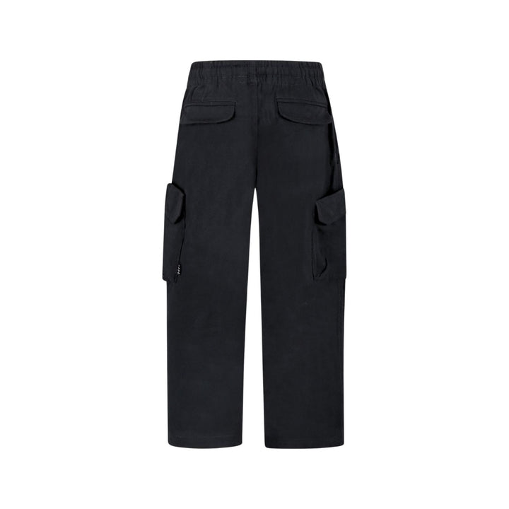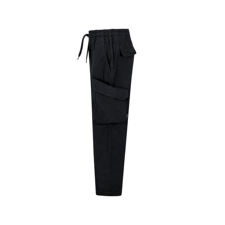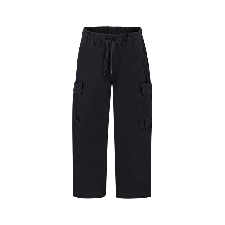Dark grey cargo trousers in organic cotton with an elastic waist, internal drawstring, and regular fit. The trousers have back pockets, side pockets, and a pocket on each thigh.