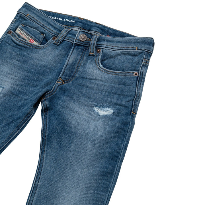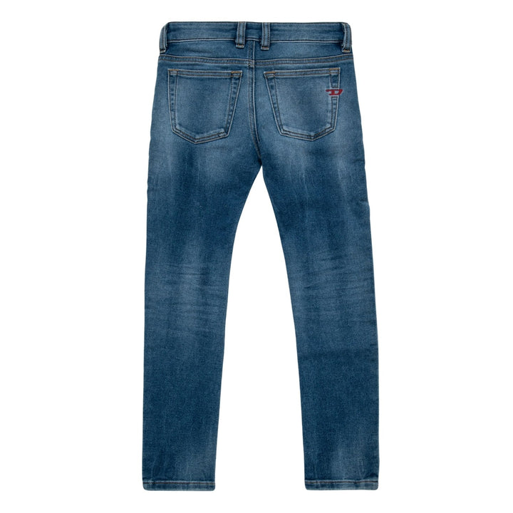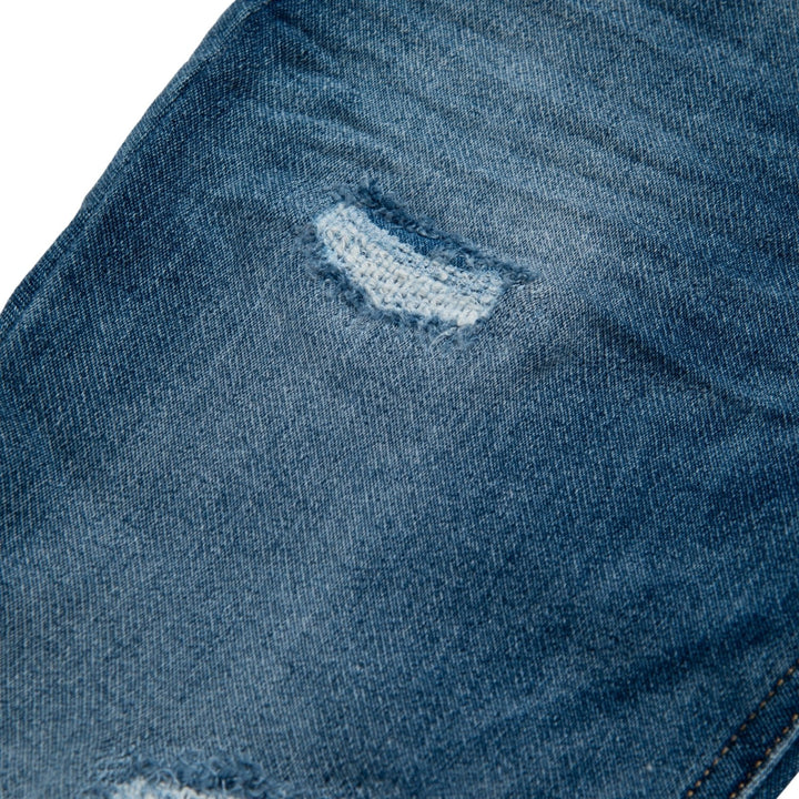 Five-pockets JoggJeans with skinny fit and punk attitude. Low waist. Made of soft-handle mid-blue denim, distinguished by gradients, whiskers and contrasting coloured seams. Mending zig-zag breaks at the front. The design features an adjustable waist
