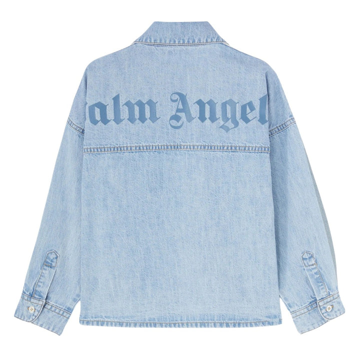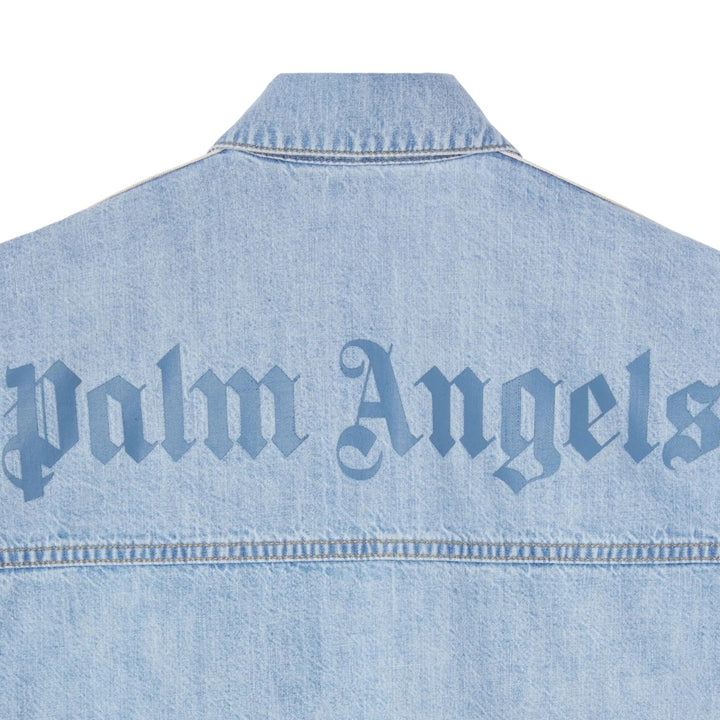 Boy blue cotton shirt with logo print to the rear, side stripe detailing, classic collar, front zip fastening, chest and side welt pockets, long sleeves, and an elasticated hem for a stylish and comfortable fit.