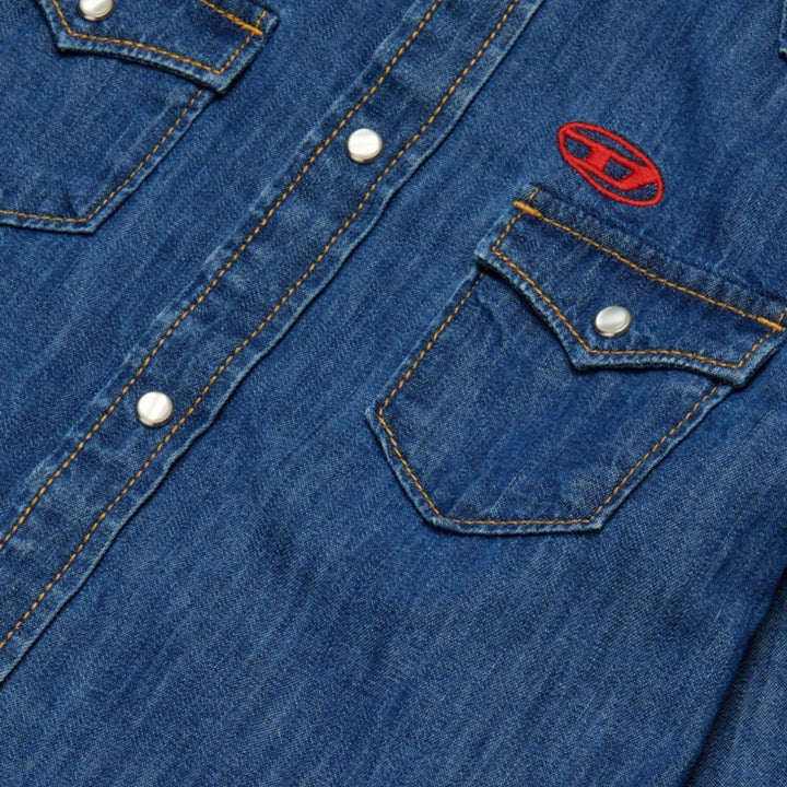 This boys shirt is cut from pure cotton denim. Pointed yokes and pocket flaps impart a quintessential Western look. Finished with an embroidered Oval D logo in contrast red yarn on the chest.