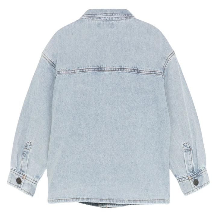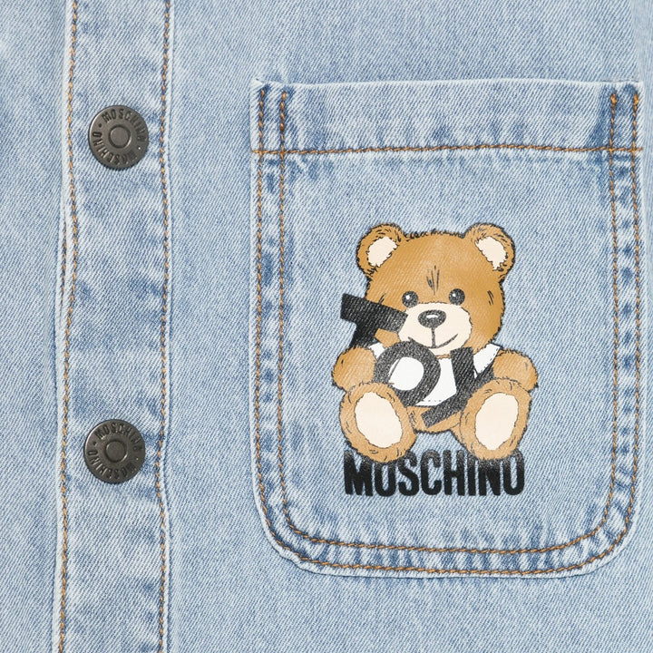 Light blue Teddy Bear-print denim shirt with press-stud fastening, press-stud cuffs, a chest flap pocket, and a chest patch pocket. Stylish and versatile for any occasion.