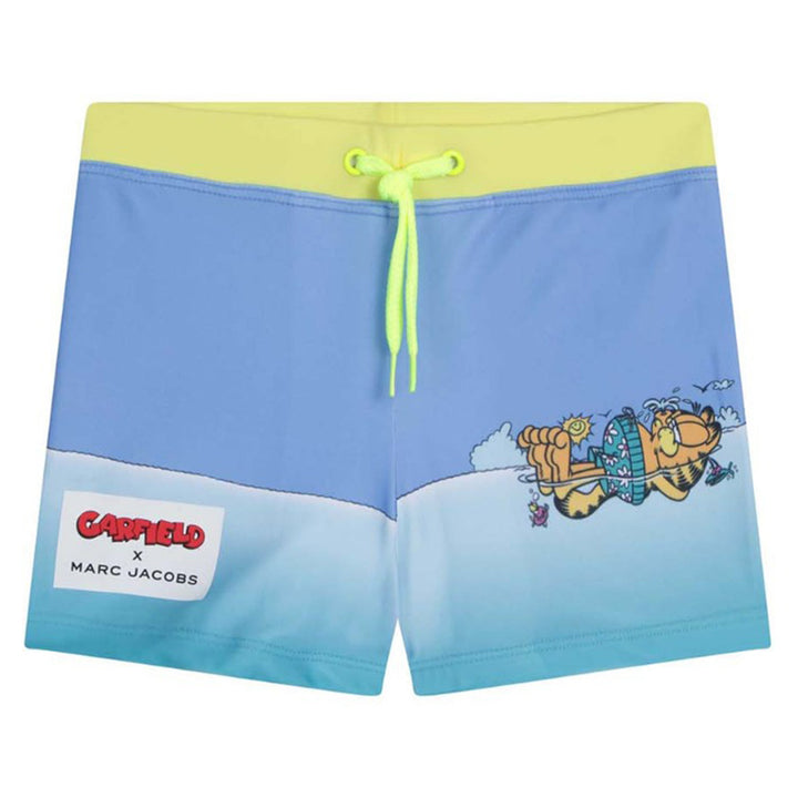 Garfield cartoon-print swimming trunks from Marc Jacobs Kids featuring light blue, cartoon print, logo print to the front, drawstring fastening and thigh-length. Be mindful to try on swimwear over your own garments.