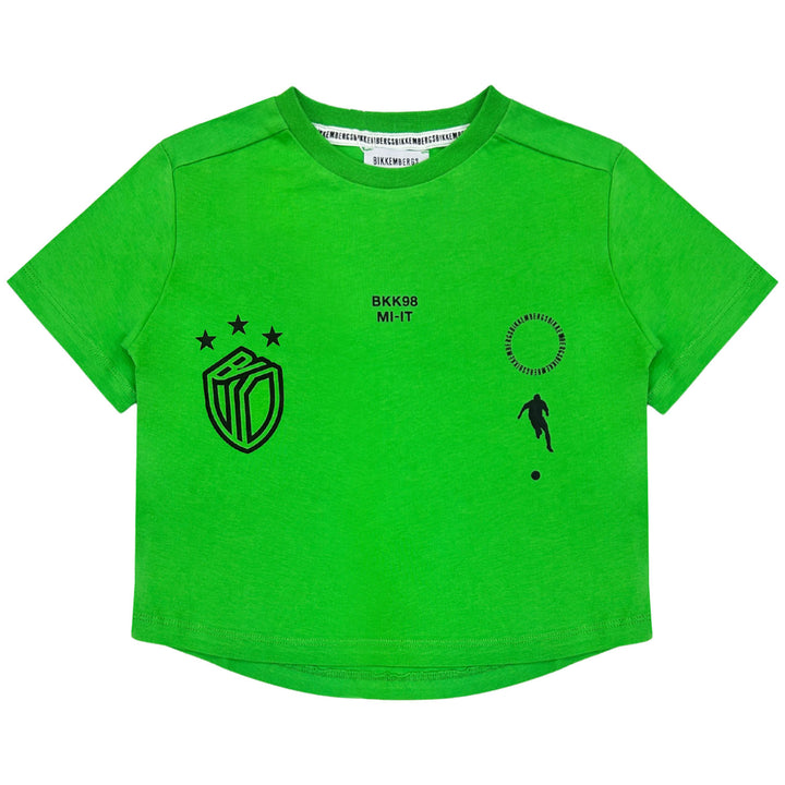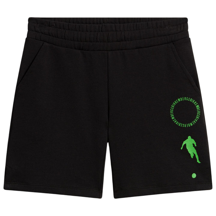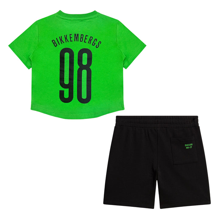 Bright and playful, this short set includes a green t-shirt with an energetic footballer graphic and bold black accents, paired with comfy black drawstring shorts perfect for sporty summer days.