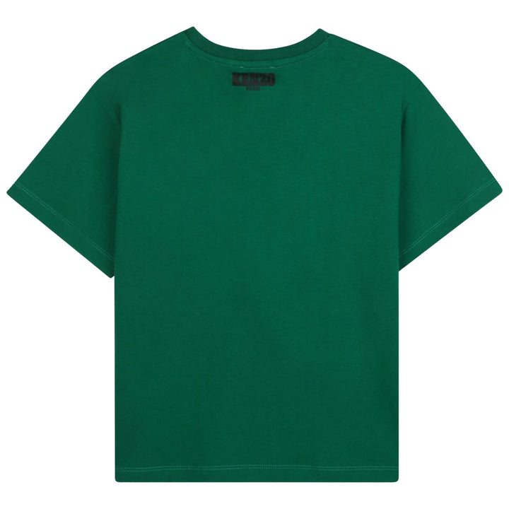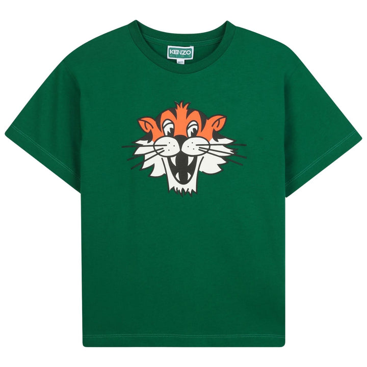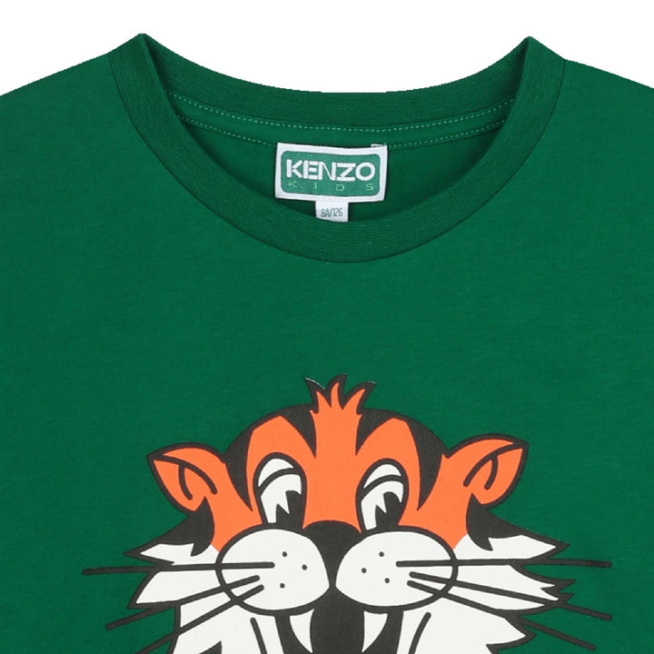 A green T-shirt for boys by KENZO KIDS, made in soft organic cotton jersey. Casual and comfortable, it has a vintage, tiger-themed logo motif on the front, combining playful elements with iconic branding.