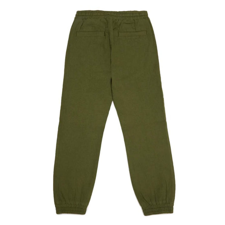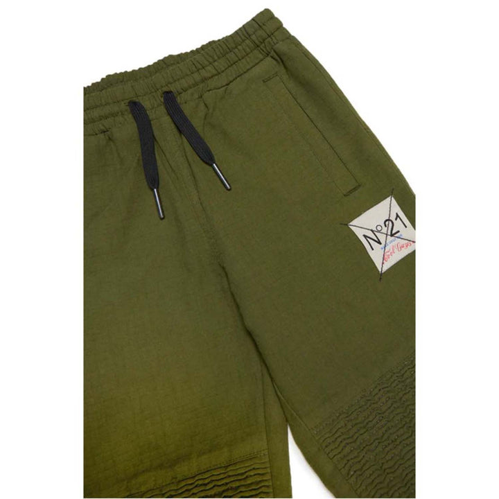 Green logo-print leg trousers from N-21 Kids featuring olive green, cotton, logo print to the front, elasticated waistband, elasticated ankles, straight leg and classic five pockets.