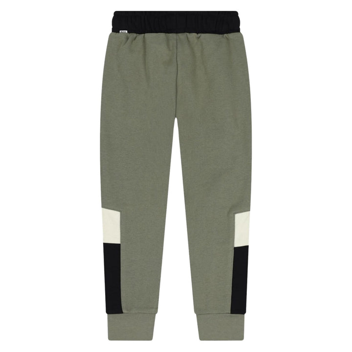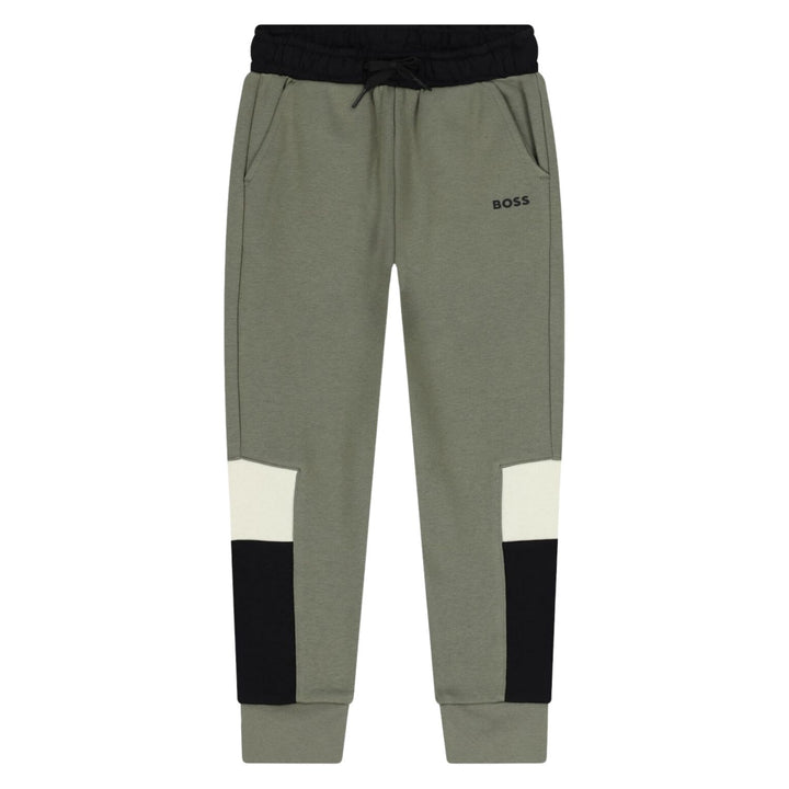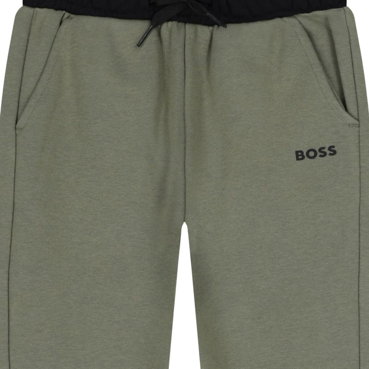 Green joggers for boys by BOSS. Made from soft cotton, they feature the brands logo print on the front and ivory and black panels on both legs. They have two pocket styling and finished with an elasticated waist and drawstring for comfortable fit.