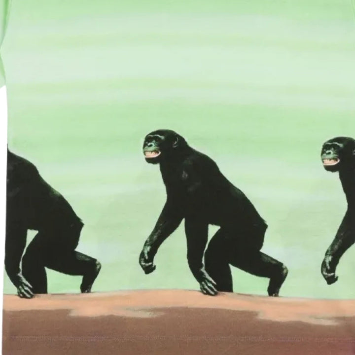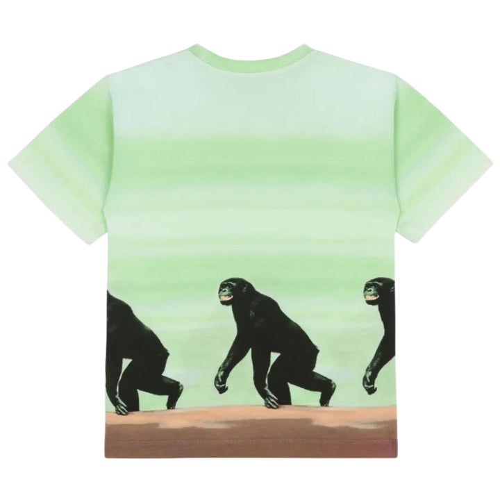 Pastel green monkey-print T-shirt with a crew neck, short sleeves, straight hem, and a logo print on the sleeve. Fun and casual for everyday wear.