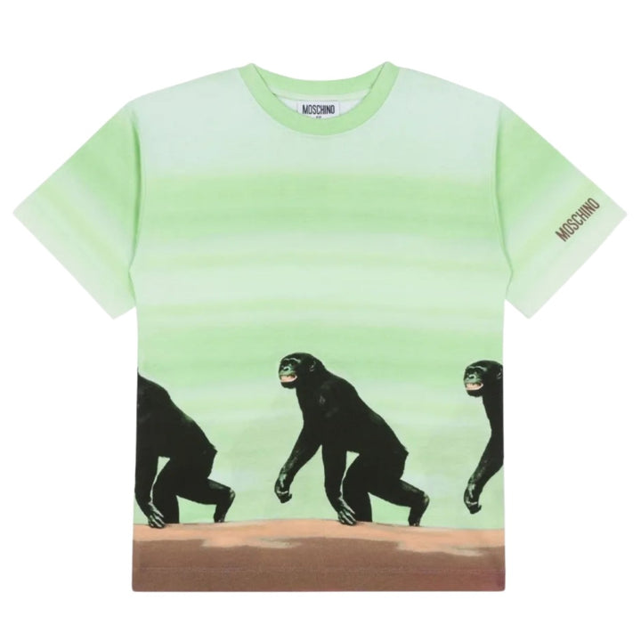 Pastel green monkey-print T-shirt with a crew neck, short sleeves, straight hem, and a logo print on the sleeve. Fun and casual for everyday wear.