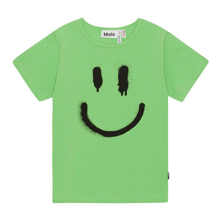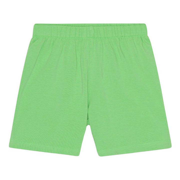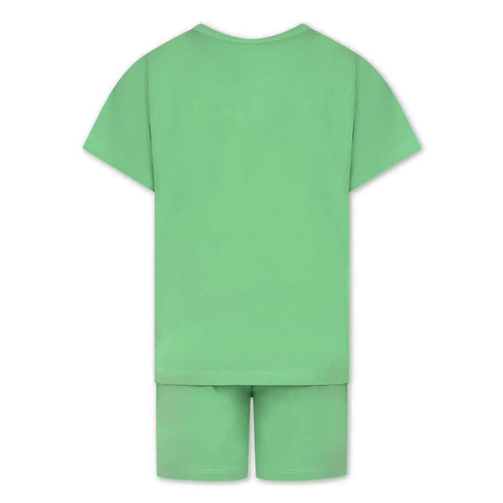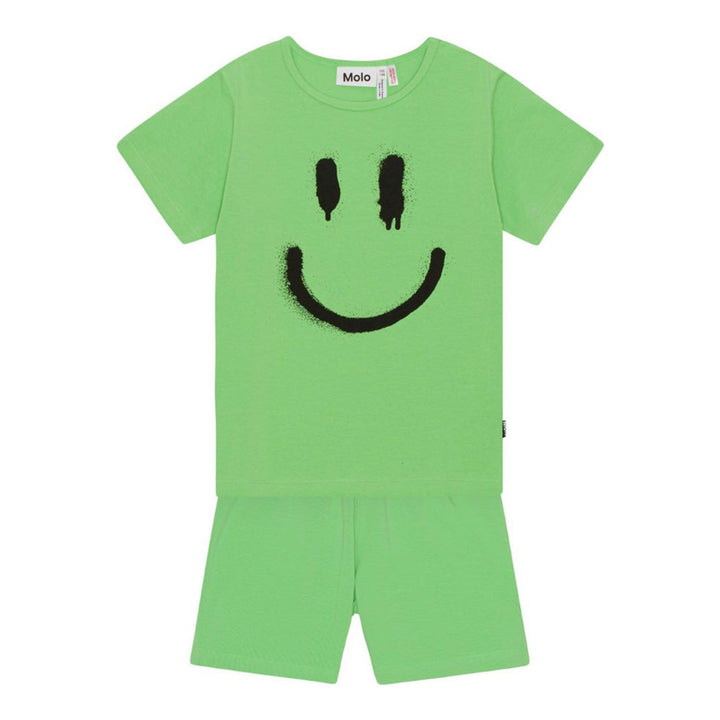 Boys green nightwear set with a print of a smiling face in organic cotton. The set has a loose t-shirt and a pair of shorts with an elastic waist.