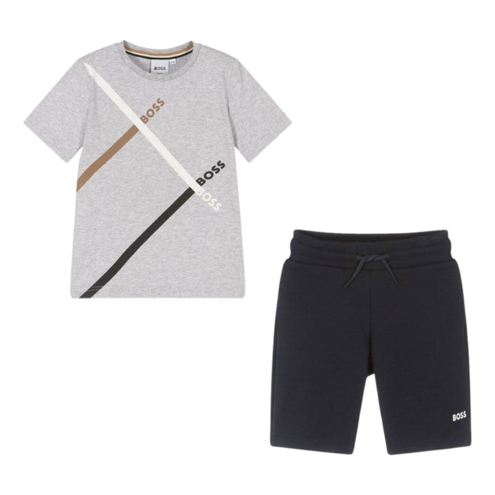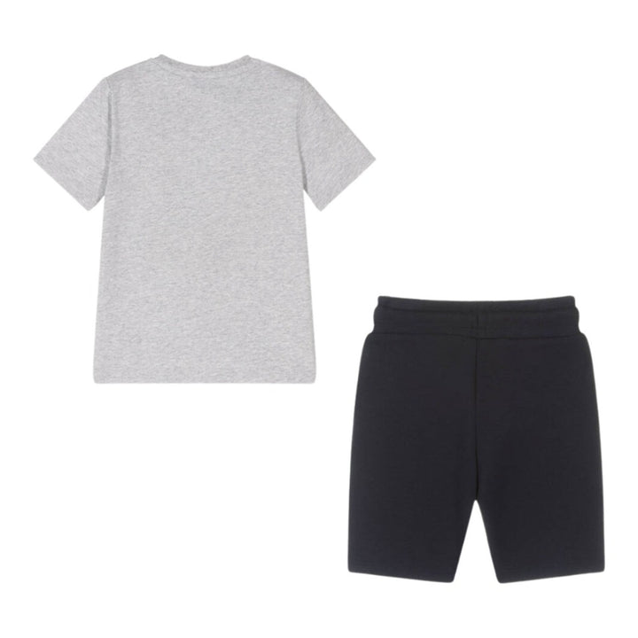 Mini-me shorts set for boys by BOSS, made in soft cotton jersey. The grey T-shirt is printed with an abstract logo in the brands signature colours for instant recognition. The navy blue mid-weight jersey shorts have an elasticated waist which can be