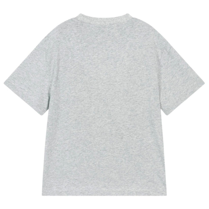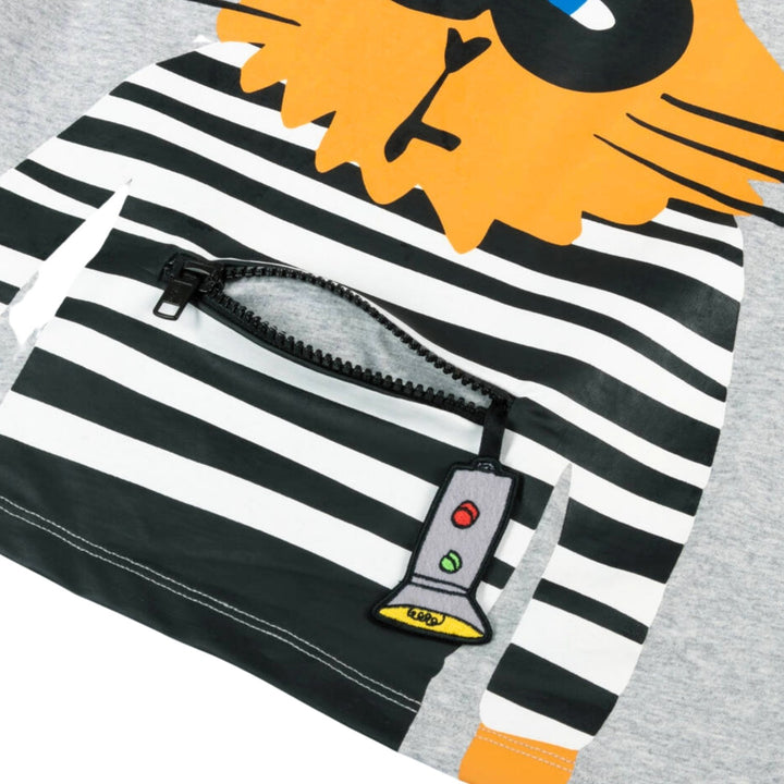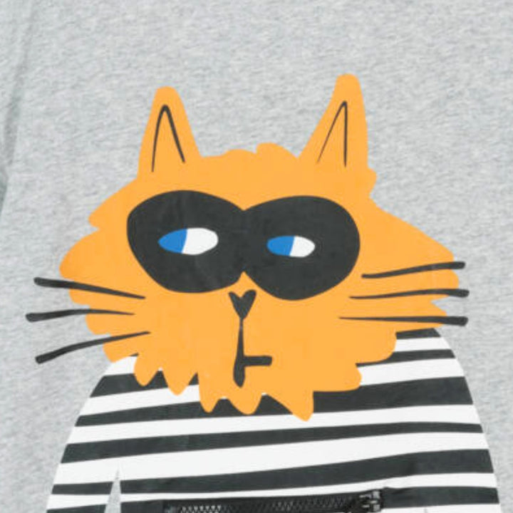 Grey marl T-shirt for boys by Stella McCartney Kids, made in soft organic cotton jersey. This graphic style has a mischievous cat motif on the chest, with a wallet-style zip-up pocket and a fun torch charm.