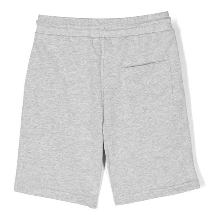 From British brand Stella McCartney Kids, casual grey shorts for boys made in mid-weight organic cotton jersey. For an instantly recognisable look, one leg is printed with different colour stripes and the brand name in red. The elasticated waist has