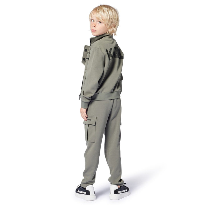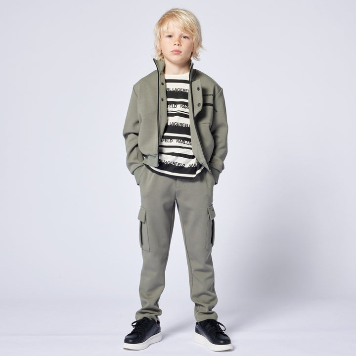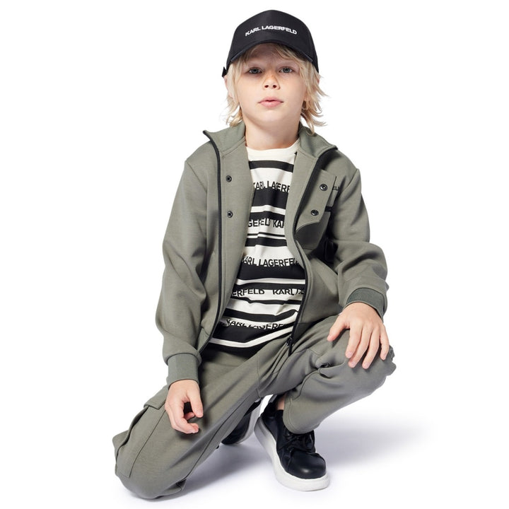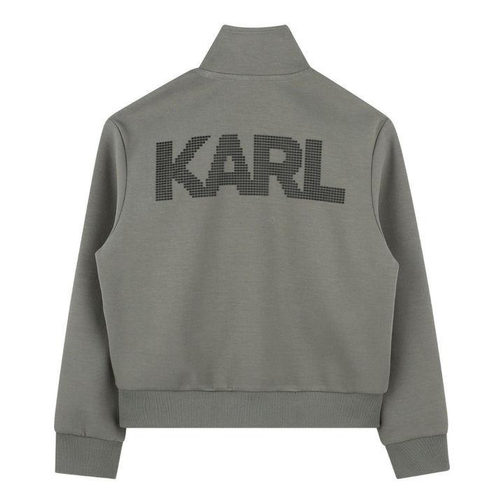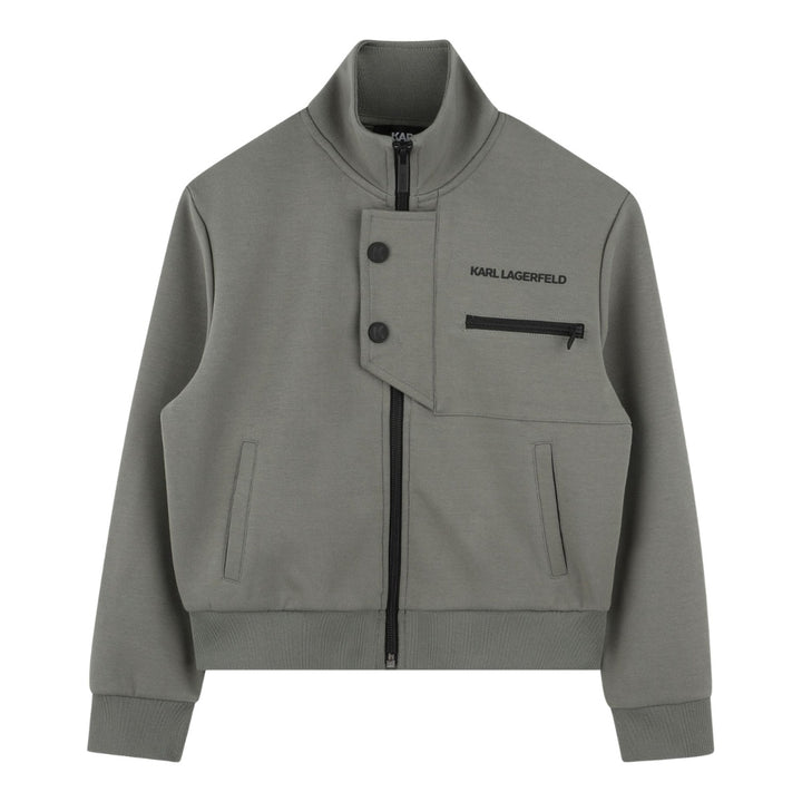 This Karl Lagerfeld Kids grey zip-up jacket is a perfect blend of style and functionality. Designed with a sleek, contemporary look, the jacket features a high collar with an asymmetrical button flap for added sophistication.